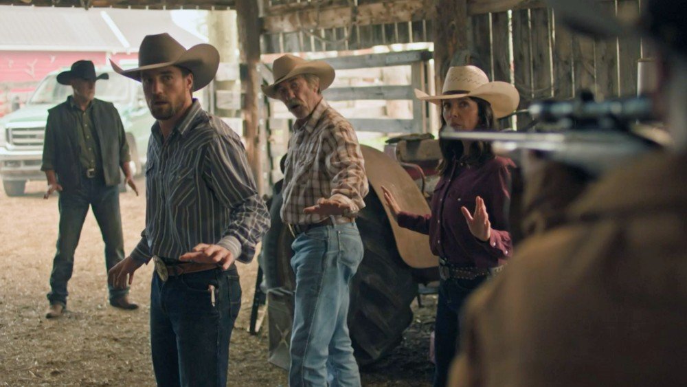 Lou pulled out her phone, ready to call the police, but before she could, one of the rustlers, Jimmy, pulled up. Jack held him at gunpoint and demanded to know where the rest of the cattle were. But before they could get any answers, Wes himself crept up behind them – his own gun drawn.